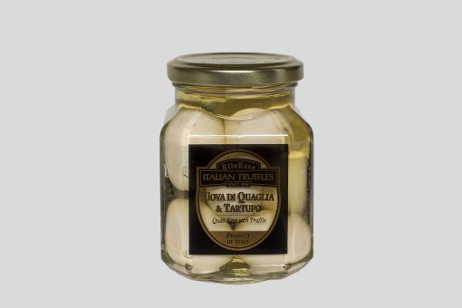 Pregiate uova di quaglia bollite e già sgusciate a mano, arricchite dal tartufo bianco; da scolare e servire, per arricchire antipasti e aperitivi.